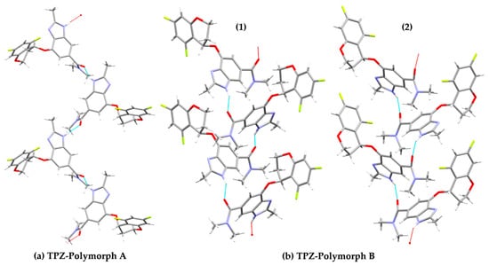 From a molecular perspective, both polymorphs exhibit crystal packing arrangements stabilized by intermolecular interactions, including hydrogen bonding, π–π stacking, and π–H interactions. Under accelerated conditions (40 °C/75% RH), both the amorphous form and Polymorph B were observed to convert into Polymorph A within approximately eight weeks, as confirmed by PXRD [20] (see also Section S1). These observations raise the question of whether such transformations represent typical polymorphic conversions, involve unknown intermediate forms, or reflect alternative crystallization pathways. To date, no additional crystalline forms of TPZ have been identified beyond the known three.