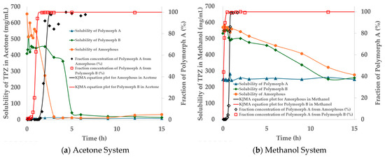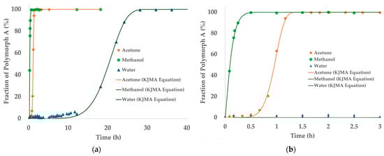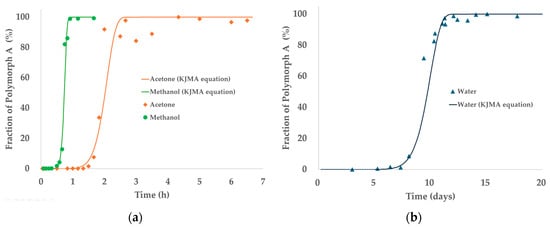 Experimentally, we investigated the phase behavior of TPZ through solubility measurements, DSC, and time-dependent PXRD. The absence of a glass transition temperature and the presence of thermal events only above 100 °C suggested that phase transformation does not proceed via solid-state transitions but rather through a solvent-mediated mechanism. Slurry experiments monitored by PXRD confirmed the conversion of both the amorphous form and Polymorph B into Polymorph A over time. This process was categorized as an SMPT [21,22,23], and its kinetics were evaluated using the KJMA model to derive empirical rate parameters [24,25]. Additional solubility monitoring and PXRD analysis revealed no anomalous behavior or evidence of unknown polymorphs, confirming that only the three known forms participate in the observed transitions.