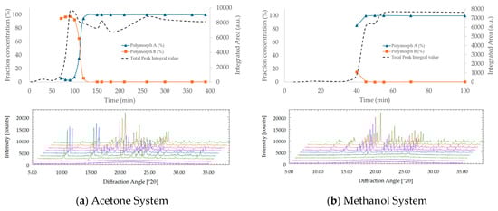 For Polymorph B, which gradually converted to Polymorph A, relative phase quantification was conducted based on two-phase composition (%). The diffraction data were analyzed using the Rietveld refinement program Profex (version 5.2) [27], which employs the BGMN refinement kernel based on a Bayesian algorithm optimized for phase quantification. The crystal structures used for Rietveld refinement were retrieved from the Cambridge Crystallographic Data Centre (CCDC 2376144 for Polymorph A and 2387615 for Polymorph B).