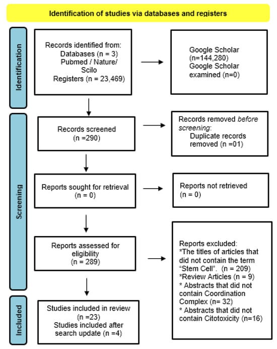 PRISMA diagram of the systematic review. The retrieval process is illustrated, covering the stages of identification, screening, eligibility assessment, and inclusion of studies. A total of 23,469 studies were initially identified through database searches. After removing duplicates, 289 records were screened by title and abstract. Subsequently, 23 full-text articles were assessed for eligibility, resulting in 27 studies included in the qualitative synthesis. In the excluded reports, articles whose abstracts did not contain the following were excluded: Titles with the term cancer stem cells present, literature review articles, abstracts that do not specify the coordination complex and that do not contain cytotoxicity assays. Note that n indicates the number of studies included at each stage. This diagram provides a clear overview of the study selection and reasons for exclusion throughout the process.