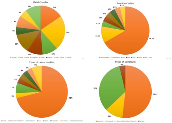 Graphical representations showcasing the percentages of general characteristics extracted from the analyzed articles. These characteristics include the country of origin of studies, the types of cancers investigated, the metal complexes examined, and the types of cell death identified in the analysis results.