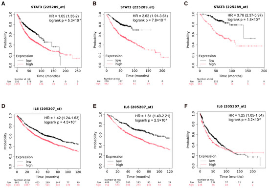 Association of IL-6/STAT3 with survival in advanced lung cancer patients. (A) Prognostic correlation of STAT3 protein expression in unclassified lung cancer; (B) STAT3 protein expression in the adenocarcinoma cohort; (C) STAT3 protein expression in the advanced-stage adenocarcinoma cohort; (D) prognostic correlation of IL-6 protein expression in unclassified lung cancer; (E) IL-6 protein expression in the adenocarcinoma cohort; (F) IL-6 protein expression in the squamous cell carcinoma cohort. Data source: Kaplan–Meier Plotter (https://www.kmplot.com/analysis/index.php?p=home, accessed on 15 December 2024). Hazard ratios (HRs), 95% confidence intervals (CIs), and logrank p-values are indicated on the plots.