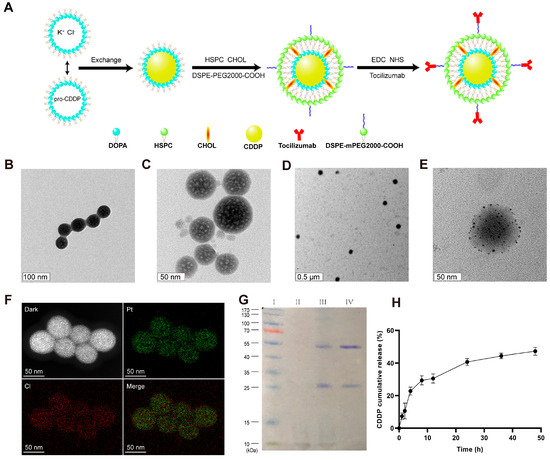 Characterization of LPC-TCZ nanoparticles. (A) Schematic representation of the synthesis route for LPC-TCZ nanoparticles. (B) TEM images of the LPC core. (C–E) TEM images of LPC-TCZ nanoparticles. (F) Elemental mapping of the LPC core, showing the uniform distribution of platinum and chlorine elements. (G) SDS-PAGE image of marker (lane I), LPCs (lane II), LPC-TCZ NPs (lane III), and free TCZ (lane IV). (H) In vitro cumulative release curve of cisplatin from LPC-TCZ nanoparticles (n = 3).