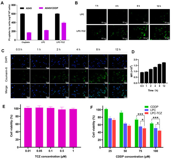 In vitro cellular uptake and anti-tumor effects of particles. (A) Uptake of free cisplatin, LPC, and LPC-TCZ by A549 and A549/CDDP cells at 48 h. (B) Images from fluorescence microscopy display the absorption of LPC and LPC-TCZ at various time intervals (1 h, 4 h, 8 h, and 12 h). (C,D) Cellular uptake of LPC-TCZ/coumarin 6 by A549/CDDP cells. (E) Effects of TCZ on the proliferation of A549/CDDP cells. (F) Effects of CDDP, LPC, and LPC-TCZ on the proliferation of A549/CDDP cells (n = 5; * p < 0.05; *** p < 0.001).