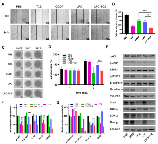 A wound healing assay was conducted to investigate the anti-metastatic effects of LPC-TCZ NPs. As depicted in Figure 4A, both CDDP and TCZ demonstrated the ability to impede cell motility. However, a more potent inhibition of wound healing was observed in groups that contained TCZ compared to CDDP. The cell migration rates were 27.36% and 12.71% for the LPC group and LPC-TCZ group, respectively (Figure 4B), indicating significantly enhanced inhibition of cell migration by nanoparticles coupled with TCZ. Furthermore, the inhibitory effect of LPC-TCZ NPs on MCTS growth was evaluated. As illustrated in Figure 4C,D, LPCs exhibited minimal effects on MCTS growth, likely due to inadequate drug release and penetration. On day 3, the volume of MCTSs in the LPCs group had increased to 146%, while the volume of MCTSs in the LPC-TCZ group had only increased to 119%, indicating that TCZ can effectively enhance the inhibitory effect of CDDP on the growth of MCTSs.