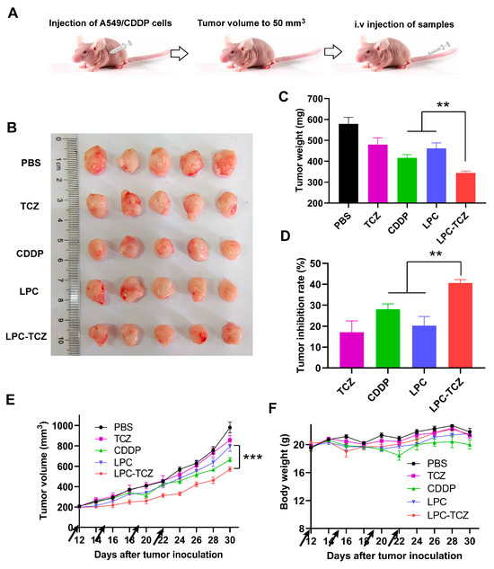 Anti-tumor effects of LPC-TCZ in a xenograft mouse model (equivalent to 1 mg/kg cisplatin). (A) Schematic diagram of the experimental procedure. (B) Image of excised tumors at the end of the experiment. (C) Tumor weight of each experimental group at the end of the experiment. (D) Tumor inhibition rate of each experimental group at the end of the experiment. (E) Changes in tumor volume during treatment. (F) Changes in body weight during treatment. The arrow indicates the time of drug administration. The data presented are the means ± standard deviation, with a sample size of n = 5. ** p < 0.01; *** p < 0.001.