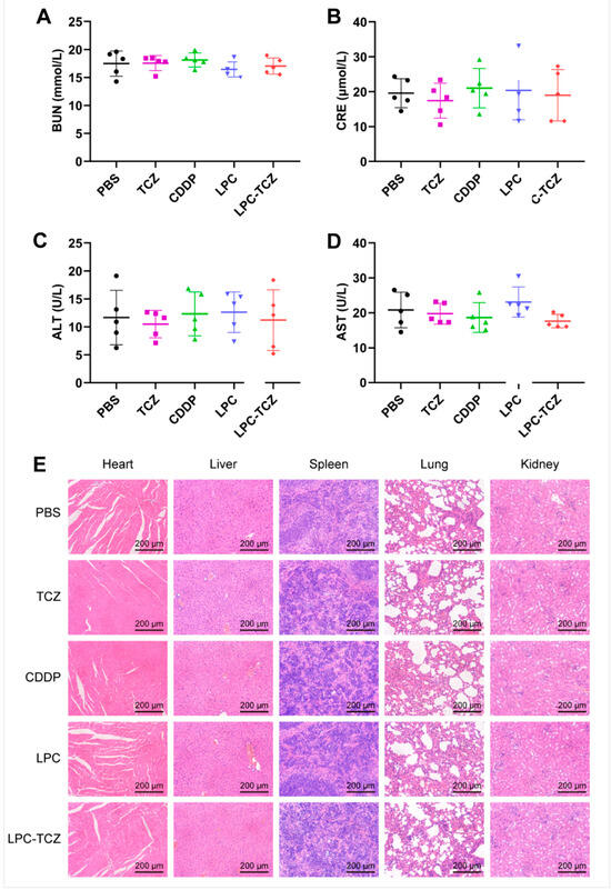 The in vivo anti-tumor effect of LPC-TCZ nanoparticles (NPs) was evaluated using the A549/CDDP xenograft model. Saline, TCZ, free cisplatin, LPC, and LPC-TCZ were further assessed in a nude mice model bearing A549/CDDP xenografts. Pharmacological intervention commenced with four doses once the tumor volume had attained a size of 50–100 mm3. On the final day of the study, the mice were euthanized, and tumor specimens were collected for analysis (Figure 6B). As depicted in Figure 4C, the tumor volume had reached approximately 200 mm3 in BALB/c nude mice 12 days post-tumor inoculation. Different drugs were administered via the tail vein on days 12, 15, 19, and 22. BALB/c nude mice were euthanized on day 30, and blood, tumors, and major organs were collected. As illustrated in Figure 6C,E, the tumors in the PBS group were the largest on day 30, with an average weight of 579.16 mg. TCZ, cisplatin, and LPC NPs inhibited tumor growth. The average tumor weight of the LPC-TCZ NP group was the lowest, at 344.00 mg. Correspondingly, LPC-TCZ NPs had the best tumor-inhibitory effect, with a tumor-inhibition rate of 40.60% (Figure 6D), suggesting that TCZ could enhance the toxicity of cisplatin to tumors. As depicted in Figure 6F, the body weight of all BALB/c nude mice fluctuated around 20 g after treatment with different drugs. On day 22, the body weight of BALB/c nude mice in the cisplatin group had decreased significantly, and the body weight gradually decreased after stopping tail vein injection, indicating that free cisplatin had a certain toxicity. The body weight of BALB/c nude mice in the LPC and LPC-TCZ NP groups did not significantly decrease, indicating that nanoparticles could reduce the toxicity of cisplatin to normal tissues. The results of serum liver and kidney indexes of BALB/c nude mice and H&E-stained sections of major organs demonstrated that LPCs and LPC-TCZ NPs had no significant liver or kidney toxicity (Figure 7), indicating that the nanoparticles had good biocompatibility, which was consistent with the weight changes.