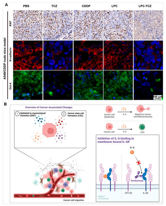 Mechanisms underlying the reversal of cisplatin resistance via LPC-TCZ through the regulation of IL-6 in tumor tissues of xenograft mouse models. (A) Fluorescent imaging of immunohistochemical markers Ki67, N-cadherin, and Oct-4 in tumor tissues. The Ki67 maker is shown in brown, N-cadherin in green, and Oct-4 in red, while the nucleus is shown in blue. (B) Schematic illustrating the anti-tumor mechanisms of LPC-TCZ NPs in NSCLC. IL-6 regulates tumor EMT processes and stem cell properties by inducing gp130 dimerization and promoting JAK1 and STAT3 phosphorylation. By binding with IL-6R, TCZ enhances the expression of E-cadherin while simultaneously reducing the expression of N-cadherin, vimentin, and Snail. This modulation effectively reverses the EMT process and inhibits cellular migration. Additionally, TCZ reduces the number of stem cell populations in tumor cells by inhibiting the expression of tumor stem cell markers Oct-4, Sox-2, and Nanog, as well as enhancing the inhibitory effect of CDDP on tumor stem cells, thus improving the efficacy of CDDP.