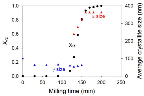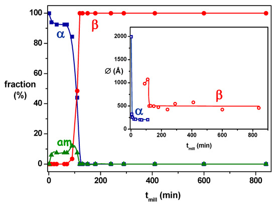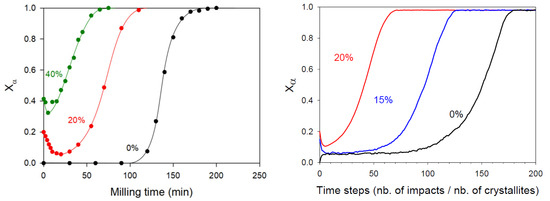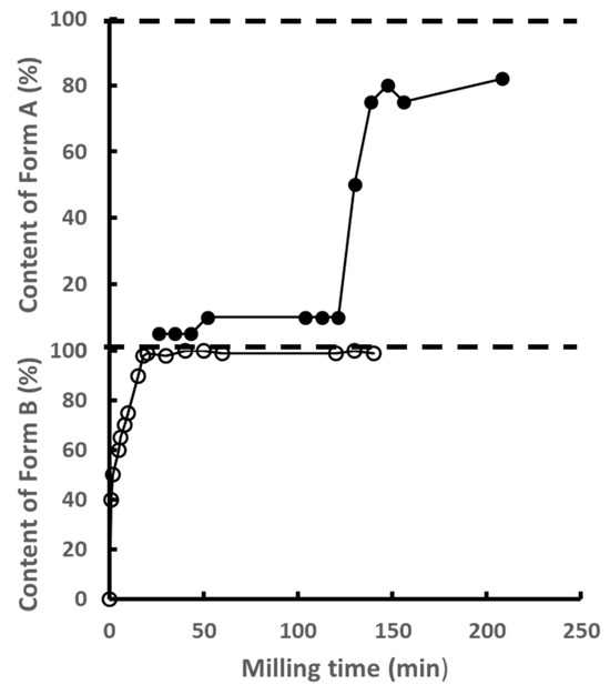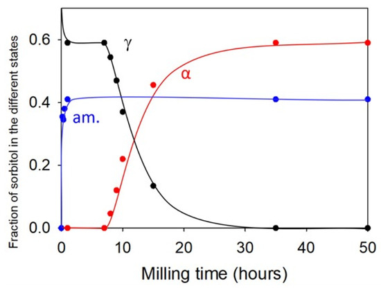 - Transient amorphization is followed by a more or less rapid recrystallization when the milling is performed above Tg. If this recrystallization occurs towards the starting polymorphic form, no apparent structural change is observed. On the other hand, if the recrystallization occurs towards another polymorphic form, an apparent polymorphic transformation is observed. The nature of the form which recrystallizes can hardly be anticipated as one or several metastable phases can develop as predicted by the Ostwald’s rule of stages [87]. However, in practice, the recrystallized form is often identical to that obtained for the recrystallization of the corresponding quenched liquid upon heating.