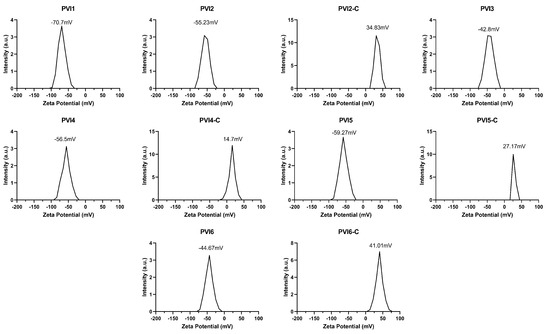 Zeta potential readings of various formulations of fabricated PLGA microparticles, including both uncoated and chitosan-coated samples. The letter “C” in the formulation names denotes chitosan coating (e.g., PVI4-C represents the PVI4 formulation coated with chitosan).