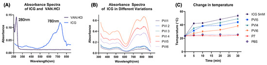 (A) Absorbance spectra of raw ICG and Van.HCl, (B) Absorbance spectra of Indocyanine Green in various PLGA-Van.HCl-ICG MP formulations, (C) Temperature change in various samples under NIR light exposure, showing significant photothermal activity of fabricated microparticles compared to control sample P7 and standalone PBS.