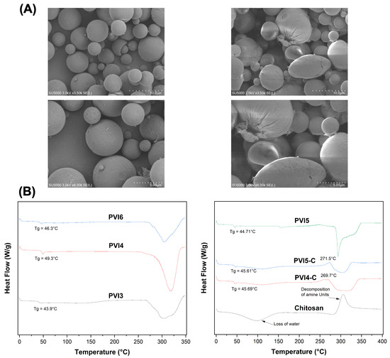 (A) SEM images uncoated (Left) and coated (Right) PLGA microparticles, (B) Left: DSC thermogram of uncoated microparticles (PVI3, PVI4, PVI6), Right: DScC thermogram of chitosan-coated microparticles, pure chitosan and uncoated PVI5.