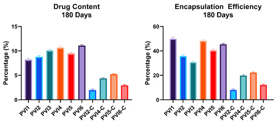 Graphical representation of: (Left) Drug Content, and (Right) Encapsulation Efficiency of fabricated microparticles 180 days after fabrication.