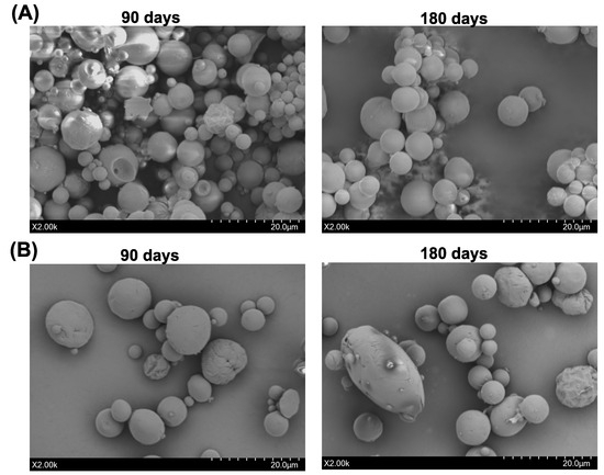 SEM images of (A) Uncoated and (B) Chitosan-coated PLGA microparticles 90 days (Left) and 180 days (Right) post-fabrication.