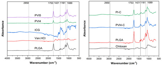 FTIR analysis of ingredients used in the formulation of microspheres PLGA, Van.HCl, ICG, and different formulations: PVI4, PVI4-C.