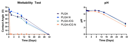 The results for the contact angle and pH measurements are shown in Figure 9. There was a significant effect of subjecting NIR light to PLGA-ICG films, causing the film to break apart within 24 h of exposure. This is due to the heating of ICG, which led to maximum surface degradation with negligible bulk degradation of the film, resulting in a drop in an enormous drop in the contact angle. Furthermore, the molecular weight of the PLGA used for this study is low, subsequently leading to faster degradation. The pH readings do not have significant changes, which stipulates that there was not much PLGA subsequently causing the pH to drop. On day 31, the PBS in which the films were dispersed was highly acidic, which is because of the hydrolysis (degradation) of the polymer leading to the release of lactic and glycolic acids [74]. Due to the presence of a lower surface area in the PLGA films, the initial degradation is primarily restricted to the surface, whereas the microparticles have a higher surface area, which would facilitate bulk degradation and a quicker release of the drug that is present inside [75].