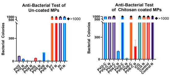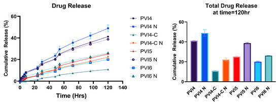 Therefore, PVI2, which had an intermediate drug concentration, was selected as the optimal formulation. Similar formulations based on PVI2 (PVI4, PVI5, and PVI6), which varied in ICG concentrations, displayed comparable DC and EE. A significant decrease in DC was observed in the coated particles, likely due to drug dissolution into the buffer solution during the chitosan coating process. Notably, PVI5-C demonstrated higher EE than the other coated particles, aligning with its superior antibacterial performance, where it more effectively eliminated bacteria.