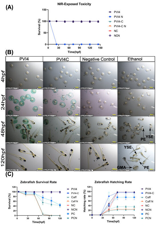 To assess the biocompatibility of the fabricated microparticles, zebrafish embryos were collected 4-5 h post fertilization (hpf). For each study, 15 healthy embryos were transferred into a 2 mL Eppendorf tube. A solution of freeze-dried microparticles (PVI4) of 250 g/mL was prepared. The ethanol (2% (v/v)) and caffeine (Caff) (200 ppm) served as a positive control (PC), and untreated zebrafish in regular fish water with methylene blue served as a negative control (NC). The group exposed to ethanol is designated as PC, while PCN represents the same group subjected to NIR light stimulation. Similarly, Caff and Caff N denote the caffeine-exposed groups without and with NIR light stimulation, respectively, and NC and NCN represent the control group under the same conditions. Then, 1 mL of each solution was transferred into Eppendorf tubes. All groups had one group exposed to NIR light (808 nm, 0.3 W/cm2 for 30 min), while the other was unexposed. After exposure, all embryos were transferred to a 6-well plate containing 4 mL of the same media (fish water for the negative control, 2% (v/v) ethanol for the positive control, 250 g/mL of freeze-dried PVI4 microparticles, 200 ppm caffeine solution). The hatching and survival rate of the zebrafish embryos were evaluated by direct microscopic observation.