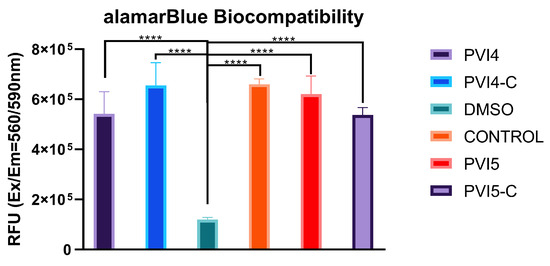 Each well of a 96-well plate was seeded with 6000 cells and allowed to attach for 36 h. After this period, the media was discarded, and the cells were washed with PBS. The cells were then treated with 0.2 mL of lyophilized microparticles (PVI4, PVI4-C, PVI5, PVI5-C), each at a concentration of 500 g/mL, dispersed in DMEM containing 1% penicillin-streptomycin and 10% FBS. Half of the wells containing microparticles and cells were exposed to NIR light at 0.3 W/cm2 power and an 808 nm wavelength, while the other half remained unexposed. A 3% (v/v) in cell culture media) dimethyl sulfoxide (DMSO) solution was used as a positive control, and untreated cells served as the negative control. After 24 h, the microparticles were removed and the alamarBlue™ working solution was added to the wells. The cells were incubated for 2 h, and then transferred to a black 96-well plate for fluorescence measurements at excitation and emission wavelengths of 560 nm and 590 nm, respectively.