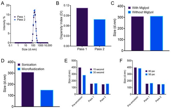 To assess the manufacturing feasibility by microfluidization, we started with a 500 mL batch nanoemulsion. However, during microfluidization, we iced the machine before using it. This leads to the solidification of coconut oil inside the microfluidizer and the loss of nanoemulsion volume. This suggests that during microfluidization, the temperature needs to be maintained above the melting point of coconut oil (24–25 °C) []. Figure 1A,B showed that for two passes in microfluidization, though the droplet size distribution remains similar, the polydispersity index of the nanoemulsion was decreased below 0.1. This result suggested incorporating two passes in the future microfluidization steps. The comparison between two batches of nanoemulsion formulated with and without Miglyol, a co-solubilizer, did not show any difference in droplet size (Figure 1C). Figure 1D shows the necessity of microfluidization for droplet size reduction compared to sonication. During the manufacturing of small-scale batches, we employed sonication for pre-emulsification and microfluidization as the final processing step. Figure 1E,F show the screening of processing parameters such as microfluidization pressure and sonication time. Though microfluidization pressure between 80 and 90 psi did not show any difference in droplet size reduction, a sonication time of 30 s resulted in a size change of 100 nm in pre-emulsion.