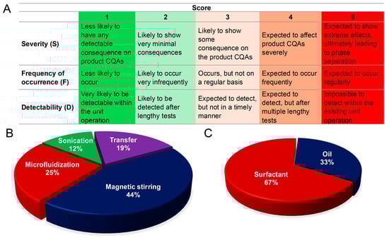Risk assessment. (A) Scoring the risk factors for severity, frequency of occurrence, and detectability. High-risk factor distribution in (B) unit operation and (C) formulation.