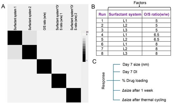Design of experiment (DoE). (A) Color map on correlations among the factors showing the confounding in the experimental design. (B) 2 × 3 level, 2-factor full factorial design with 2 center points. (C) Listed responses will be checked for the 8 runs of nanoemulsion.