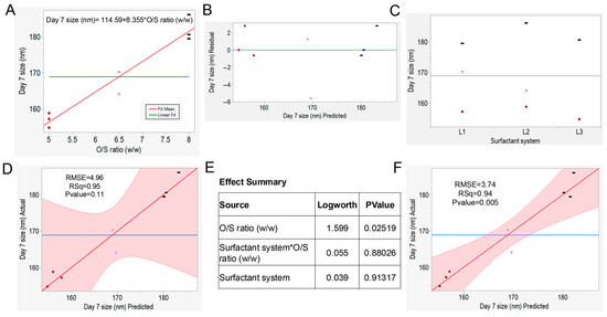 Design of experiments results: (A) bivariate fit of day 7 size by O/S ratio with predictive equation for day 7 droplet size; (B) residual vs. predicted plot of day 7 droplet size data; (C) one-way analysis of day 7 size by surfactant system; (D) actual vs. predicted day 7 size plot with interaction terms (surfactant system * O/S ratio); (E) effect summary; (F) actual vs. predicted day 7 size plot without interaction terms (surfactant system * O/S ratio).