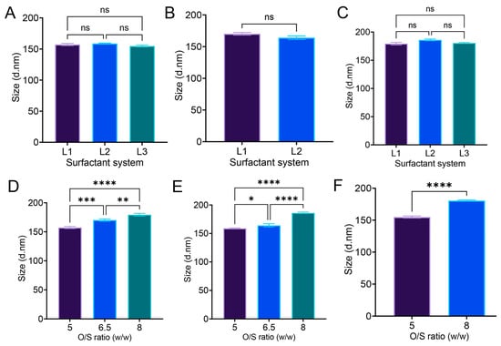 Droplet size analysis of nanoemulsion under the design of experiment. Nanoemulsion with the same O/S ratio (w/w) but different surfactant system. (A) O/S ratio 5, (B) O/S ratio 6.5, (C) O/S ratio 8. Nanoemulsion with the same surfactant system but different O/S ratio: (D) surfactant system L1, (E) surfactant system L2, (F) surfactant system L3. The data are given as mean ± SD (n = 3). One-way ANOVA with multiple comparison test, unpaired t-test, ns not significant, * p < 0.05, ** p < 0.005, *** p < 0.0005, **** p < 0.0001.