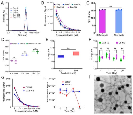 To ensure the shelf life of the nanoemulsion, the nanoemulsion colloidal and fluorescence attributes need to be consistent over the storage time. The nanoemulsion droplet size and fluorescence intensity were tested on days 1, 7, 30, 230, and 365. Figure 6A,B showed the consistent droplet size distribution and fluorescence intensity of CXB NE under storage conditions. In Figure 6C, the thermal cycling stability of CXB NE results in an insignificant change in size after eight cycles of 4 °C and 50 °C. This thermal cycling study was performed to inform storage conditions and estimate the shelf-life of the nanoemulsion []. In Figure 6D, nanoemulsion showed insignificant size change after 72 h of incubation in water, Dulbecco’s Modified Eagle Medium (DMEM), and 20% Fetal Bovine Serum (FBS) in DMEM. This test is critical as the nanoemulsion was formulated as a parenteral theranostic platform, which would expose the nanoemulsion to biological fluid []. The formulation was scaled up from a 100 mL batch to a 500 mL batch. For the small-scale (100 mL) batch, we used sonication as a pre-processing step followed by microfluidization with an M110S microfluidizer. For the large-scale (500 mL) batch, we used a hand-mixer as a pre-processing unit, followed by microfluidization with an M110P microfluidizer. Although both microfluidizers have a similar type of interaction chamber and processing mechanism, they differ in terms of their processing capacity. We have successfully transferred the process from the small-scale instrument to the large-scale without having any significant differences in the colloidal properties of the nanoemulsion (Figure 6E). Figure 6F, G demonstrated that CXB NE and DF NE have no significant differences in droplet size and fluorescence intensity. This is critical to establish that CXB NE and DF NE are comparable for a logical interpretation of future in vitro and in vivo work. Figure 6H shows the importance of transcutol for the long-term stability of ICG. Batch 1 with no transcutol in the formulation showed a drastic loss of fluorescence intensity after 2 months of storage, as compared to consistent fluorescence intensity from batch 2 with transcutol. The morphological characterization from TEM showed the spherical shape of the nanoemulsion droplets (Figure 6I).