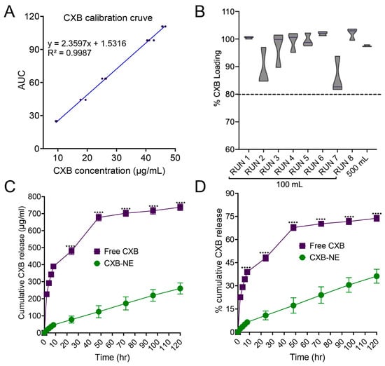 HPLC quantification and in vitro drug release study: (A) CXB calibration curve with triplicate data points at each concentration; (B) % CXB encapsulation in DoE runs, and large-scale nanoemulsion, quantified using RP-HPLC; (C) cumulative percentage of CXB release from nanoemulsion and free-CXB solution in release media containing 1X PBS: methanol (4:1); (D) cumulative amount of CXB release in µg/mL from nanoemulsion and free-CXB solution. The data are given as mean ± SD (n = 3). Two-way ANOVA with Šídák’s multiple comparison, **** p < 0.0001.
