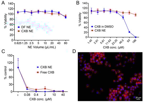 For the cellular uptake study, RAW 264.7 (ATCC TIB-71) macrophage cells were plated in a chamber slide (TM system Lab-Tek@II, Thermo Fisher Scientific Inc., Waltham, MA, USA) at 20k cells/well in 0.5 mL full cell culture medium in each chamber. The chamber slides were then incubated at 37 °C with 5% CO2 overnight for attachment. The cells were treated with CXB NE (μL/mL) for 6 h. The exposed medium was washed away with 0.5 mL of warm 1X PBS, and the cells were fixed with 4% paraformaldehyde in 1X PBS solution (w/v) for 20 min. Cells were washed with 0.5 mL 1X PBS twice after fixation. A total of 3–4 drops of ProLong Diamond mountant were applied to the chamber slide after the chamber wall was removed. A cover slip was placed on the slide, which was then stored in a dark area for 2–3 h for DAPI nuclei staining. Cellular uptake images were taken with the Keyence microscope.