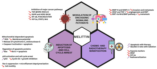 Melittin also inhibited epidermal growth factor (EGF)-induced cell motility and suppressed the expression of matrix metalloproteinase (MMP)-9 by blocking the NF-κB and PI3K/Akt/mammalian target of rapamycin (mTOR) signaling axes [19]. Additional studies have shown that melittin downregulates oncogenic pathways, including Akt, NF-κB, hypoxia-inducible factor 1-alpha (HIF-1α), Wnt, and signal transducer and activator of transcription 3 (STAT3), further supporting its ability to interfere with cancer-associated signaling networks [20,21].