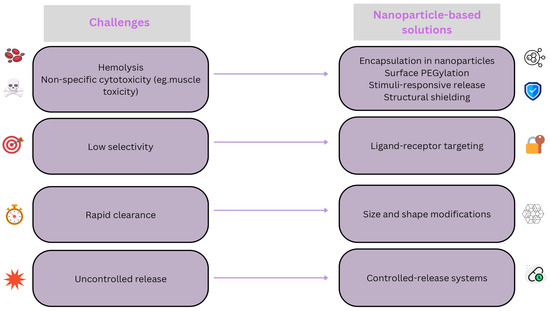Challenges of melittin nanotherapy and corresponding nanoparticle-based solutions.