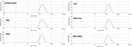 The particle size of liposomal formulations containing CBD, DMC, and CELE and their mixtures (CBD + CELE and CBD + DMC) is characterized using dynamic light scattering (DLS).