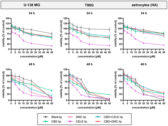 Thus, this study investigated the cytotoxic potential of liposomal CBD, CELE, and DMC in three human-derived cell lines, i.e., U-138 MG, T98G (both being TMZ-resistant GBM cell lines), and non-cancerous human astrocytes (HA). The analysis was performed at two time points and showed that all tested nanoformulations influence cell viability of both tumor and normal cells in a concentration- and time-dependent manner. It is important to indicate that GBM cells were found to be more susceptible to the cytotoxic effects of the analyzed nanoformulations as compared to the HA cells, and the concentrations already active towards cancer cells (5 and 10 µM) were safe for the HA cells. This finding paves the way for future in vivo studies of these nanoformulations, in which the safety of non-cancerous brain structures is of primary importance.