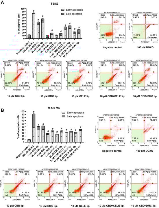 Apoptosis of T98G (A) and U-138 MG (B) cells treated with liposomal nanoformulation of CBD, DMC, and CELE and their combinations and blank liposomes for 24 h. Doxorubicin (DOXO) served as a positive control, and non-treated cells were the negative control of the assay. Values are expressed as mean ± SEM from two independent experiments. An asterisk (*) indicates the values significantly different from the untreated control cells with p < 0.05. A hashtag (#) above the bar indicates statistically significant differences compared to the untreated control for total apoptotic cells. Representative histograms are also presented.