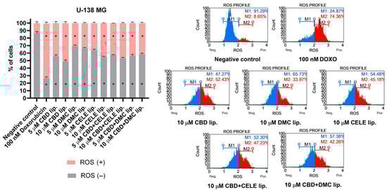 ROS profile was obtained in U-138 MG cells after 24 h treatment with CBD, DMC, CELE, CBD + CELE, and CBD + DMC liposomes. Non-treated cells and DOXO (100 nM) served as negative and positive control of the assay, respectively. ROS (+) and ROS (−) indicate cells with detected and undetected superoxide radicals, respectively. Values are expressed as mean ± SEM from two independent experiments. An asterisk (*) indicates the values significantly different from the untreated control cells with p < 0.05. Representative histograms are also presented.