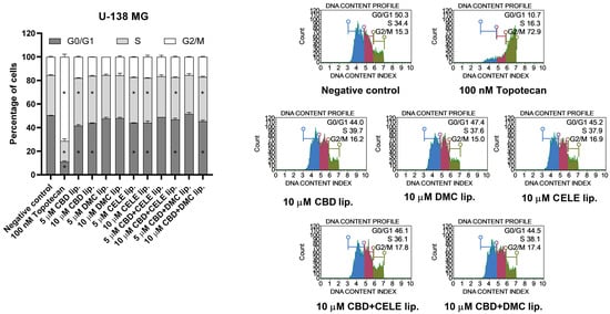Cell cycle analysis of U-138 MG cell line after 24 h of treatment with CBD, DMC, CELE, CBD + CELE, and CBD + DMC liposomes using the Muse Cell Cycle Kit. Non-treated cells and topotecan (100 nM) served as negative and positive control of the assay, respectively. Values are expressed as mean ± SEM from two independent experiments. An asterisk (*) indicates the values significantly different from the untreated control cells with p < 0.05. Representative histograms are also presented.