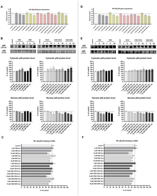 The effect of the liposomes loaded with CBD, DMC, CELE, and their combinations on the p50 and p65 mRNA expression (A,D); translocation from cytosol to nuclei of p50 and p65 (B,E); and p50 and p65–DNA binding capability (C,F) in U-138 MG cells after 24 h incubation. Data (mean ± SEM) from two separate experiments are presented as fold of control, which are defined as 100% for DNA binding capability and protein expression. Representative immunoblots are shown to analyze the cytosolic and nuclear of NF-κB subunits p50 and p65 protein levels (B,E). Bands are presented in the same sequence as the corresponding bars in the graph. A single asterisk (*) and double asterisk (**) denote statistical significance relative to the untreated control cells with p < 0.05 and p < 0.01, respectively.