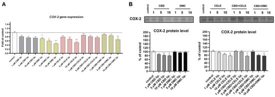 The COX-2-positive U-138 MG line is characterized by overexpression of this prostaglandin-synthetizing enzyme that plays a role in cancer’s aggressive phenotype. As we expected, after CELE-loaded liposome (10 µM) treatment, the cytosolic levels of COX-2 decreased by 20%, and COX-2 mRNA expression was reduced by 50% (Figure 9A,B). The drop in COX-2 protein expression was observed following CBD treatment in a dose-dependent manner. Also, CBD + CELE and CBD + DMC downregulated COX-2 protein expression, while the mRNA level dropped only in response to 10 µM CBD + DMC liposomes.