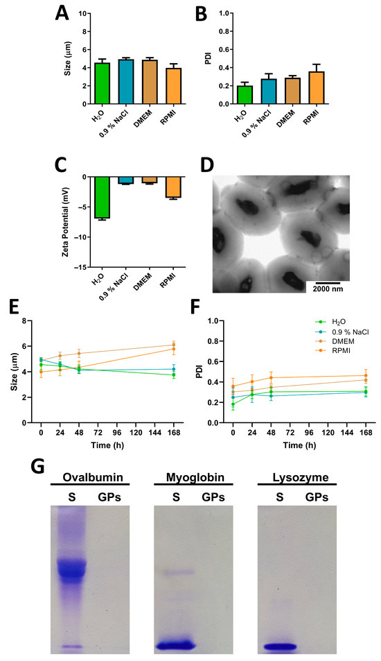 Characterization of glucan particles (GPs). (A) Mean particle size, (B) PDI, and (C) zeta potential of empty GPs measured in the same media (n = 3). (D) Representative transmission electron microscopy (TEM) image of empty GPs suspended in water. (E) Particle size and (F) PDI of GPs measured in ultrapure water, 0.9% NaCl, DMEM, and RPMI medium after incubation at 37 °C for 24 h, 48 h, and 168 h. Data are presented as mean ± SD (n = 3). (G) Evaluation of protein encapsulation capacity: 100 µL of ovalbumin, myoglobin, or lysozyme was encapsulated within GPs at a concentration of 5 mg/mL. The particles were centrifuged, and the initial supernatants were analyzed using SDS-PAGE to visualize unencapsulated protein content. Protein standards (S) were included at a concentration of 2 mg/mL for reference.