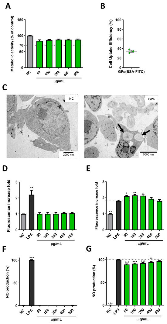 Assessment of GPs’ interactions with RAW 264.7 macrophages. (A) Cell viability, determined by the MTT assay after a 24 h GP incubation. Relative cell viability (%) was calculated compared to the negative control (n = 4). (B) Flow cytometry analysis of GPs (BSA-FITC) (5 µg/mL) internalization in RAW 264.7 macrophages at the 4 h time point. The percentage of fluorescent cells quantified to determine GP uptake (n = 3). (C) Electron microscopy images of RAW 264.7 macrophages. Untreated control cells (NC, left) and cells treated with GPs for 4 h (GPs, right). A representative image illustrates cellular ultrastructure with two internalized GPs within the cell’s cytoplasm (black arrows). (D) ROS production in RAW 264.7 cells exposed to GP formulations for 24 h. LPS (1 µg/mL) was used as a positive control, and unstimulated cells served as the negative control. The fold increase in fluorescence was calculated by comparing results with the negative control using DCFH-DA (n = 4, with three independent GP batches). (E) LPS-spiked ROS production in RAW 264.7 cells exposed to GP formulations and LPS (1 µg/mL) for 24 h. Fold increase in fluorescence was calculated by comparing results with LPS-stimulated cells using DCFH-DA (n = 3, with three independent GP batches). (F) NO production in RAW 264.7 cells exposed to GP formulations for 24 h. LPS (1 µg/mL) was used as a positive control, and unstimulated cells served as the negative control. NO production extrapolated from the calibration curve and compared to LPS-stimulated cells (100%) (n = 3, with three independent GP batches). (G) LPS-spiked NO production in RAW 264.7 cells exposed to GP formulations and LPS (1 µg/mL) for 24 h. NO production extrapolated from the calibration curve and compared to LPS-stimulated cells (100%) (n = 3, with three independent GP batches). Data are presented as mean ± SEM. Statistical analysis conducted using the Kruskal–Wallis test. *, **, and *** indicate significant differences compared to the control group with p ≤ 0.05, p ≤ 0.01, and p ≤ 0.001, respectively.
