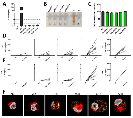 Evaluation of GPs’ effects on hemolysis and PBMCs. (A) The hemolytic effect of GPs on human whole blood compared to cells treated with Triton X-100 (PC—positive control) and cells treated with PBS (NC—negative control), with no hemolysis observed (n = 3). (B) Visual representation of tubes after the hemolysis assay, demonstrating the absence of hemolysis caused by GPs. (C) Impact of different concentrations of GPs on human PBMCs’ proliferation after 72 h of incubation (n = 3) assessed by MTT assay. (D) TNF-α and (E) IL-6 production by human PBMCs following 24 h of incubation with varying GPs concentrations (n = 6). Statistical analysis conducted using the Wilcoxon matched-pairs test. Significance denoted by * indicate p-values of ≤0.05. (F) Confocal microscopy images illustrating human monocytes treated with GPs (BSA-FITC) for different time periods. GPs’ localization shown in green fluorescence, cell nuclei stained in white using Hoechst 33342, and cellular membranes stained in red with Alexa Fluor® 594. All data presented as mean ± SEM.