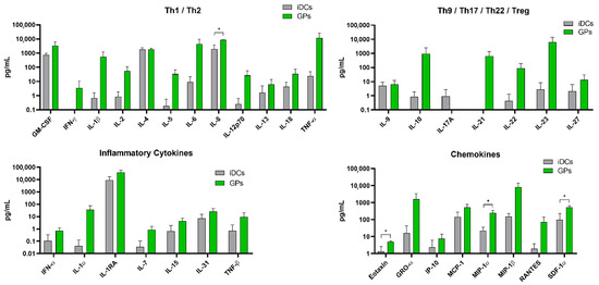 Evaluation of glucan particles (GPs)’ effects on human moDCs. Cytokine and chemokine concentrations were quantified in supernatants from human monocyte-derived dendritic cells (moDCs) treated with GPs (2.5 µg/mL) for 24 h. Statistical significance was assessed using multiple unpaired t-tests, with Bonferroni–Sidak correction applied to adjust for multiple comparisons (α = 0.05). Each analyte was analyzed independently, assuming no consistent standard deviation between groups (n = 4). Significance denoted by * indicate p-values of ≤0.05.