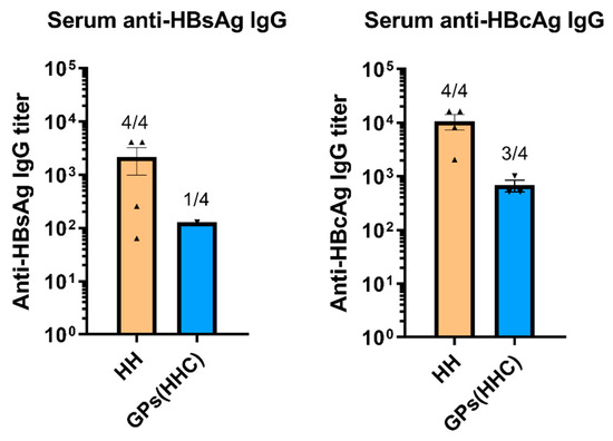 The humoral immune response to vaccination was assessed by measuring serum levels of IgG specific to HBsAg and HBcAg in the vaccinated mice (Figure 5). In the HH group, all vaccinated mice produced detectable levels of IgG specific to both HBsAg and HBcAg. These IgG antibodies indicate a robust and consistent humoral immune response to the antigens. In contrast, the GPs (HHC) group exhibited variations in the humoral response. While some mice in this group did produce IgG specific to HBsAg and HBcAg, not all individuals mounted a meaningful IgG response. Furthermore, among those mice that did produce IgG, the antibody titers were frequently lower compared to the HH group. These results suggest that while vaccination with GPs (HHC) induced humoral immune responses in some mice, the response was less uniform and generally characterized by lower antibody titers compared to the HH group. This reduced humoral response to HBV antigen vaccination can be attributed to the abbreviated vaccination schedule consisting of only two immunizations. In fact, previous studies examining GPs encapsulating 1.5 µg of HBsAg administered three times subcutaneously achieved substantially higher IgG titers, with all animals developing protective titers [10]. While this study focused on total IgG production as a first indication of humoral response, we acknowledge that further investigations are necessary to evaluate the functional quality of the antibodies generated, such as their neutralizing capacity or affinity maturation. These aspects are particularly relevant for clinical translation and will be prioritized in future studies to better understand the protective potential of GP-based vaccine formulations.