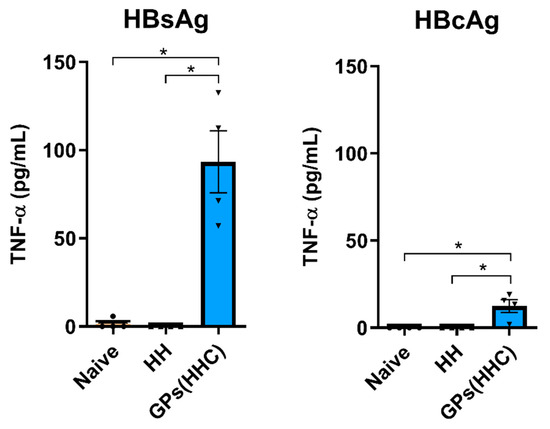 TNF-α levels in the supernatants of restimulated spleen cells measured through ELISA. Spleen cells were restimulated with HBsAg or HBcAg (1 µg/well), and TNF-α production was assessed after 96 h. Data are presented as mean ± SEM (n = 4). Statistical analysis was performed using the Kruskal–Wallis test. * indicates significant differences with p ≤ 0.05.