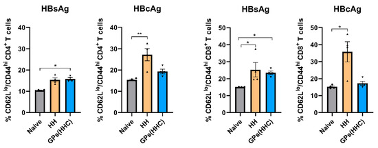 Effector memory phenotypic analysis of CD4+ and CD8+ T cells by flow cytometry after HBsAg or HBcAg (2 µg/well) restimulation for 6 h. The percentage of effector memory T cells (Tem) was evaluated as CD62Llow/CD44high expressing T cells. Data are presented as mean ± SEM (n = 4). Statistical analysis was performed using the Kruskal–Wallis test. * and ** indicate significant differences compared to the control group with p ≤ 0.05 and p ≤ 0.01, respectively.