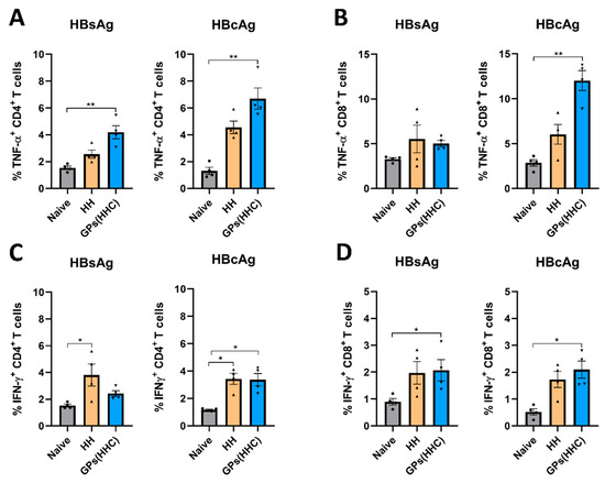 Evaluation of T cell immune responses elicited in C57BL/6 mice following vaccination with HH and GPs (HHC). Flow cytometry analysis was performed on CD4+ and CD8+ T cells after restimulation with HBsAg or HBcAg (2 µg/well). The percentage of positive TNF-α (A,B) and IFN-γ (C,D) expressing T cells was measured. Data are presented as mean ± SEM (n = 4). Statistical analysis was performed using the Kruskal–Wallis test. * and ** indicate significant differences compared to the control group with p ≤ 0.05, and p ≤ 0.01, respectively, compared to the control group.