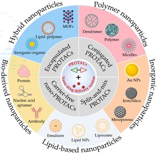 NanoDDSs offer unique physicochemical properties and versatile functionality that can address PROTACs’ delivery challenges including poor solubility, suboptimal pharmacokinetics (PK), and inadequate targeting—thereby enhancing bioavailability []. First, nanocarriers (e.g., polymeric/lipid nanoparticles, inorganic nanomaterials, and biological carriers) leverage their structural assembly and nanoscale dimensions to improve drug solubility and prolong systemic circulation []. Second, targeted surface modification with antibodies, peptides, or small molecules enhances tissue-specific delivery of nano-PROTACs, increasing drug accumulation at disease sites while minimizing off-target protein degradation []. Furthermore, nanoDDSs enhance the cellular uptake and transcellular transport of cargo, overcoming membrane permeability limitations []. Stimuli-responsive systems (pH/enzyme/light-activated) achieve spatiotemporally controlled drug release at target sites, amplifying therapeutic outcomes []. Building upon this established foundation, nano-PROTAC delivery systems have also been the subject of widespread investigation. Currently, the primary delivery strategies for nano-PROTAC systems include physical encapsulation, chemical conjugation, and carrier-free nanodrug delivery systems based on PROTACs self-assembly. Furthermore, owing to the unique structure of PROTACs and their mechanism of mediating interactions between E3 ligases and POIs, a significant strategy for developing nano-PROTAC delivery systems involves the construction of nanodrug delivery systems, with carrier participation, that are capable of inducing proximity between E3 ligases and target proteins [] (Figure 2 and Table 1).