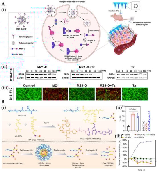 (A) (i) Illustration of the intracellular delivery of MZ1-O by a tumor-targeted polymeric carrier and the degradation of target proteins. (ii) Western blot analysis of BRD4 degradation upon the addition of various concentrations of MZ1-O or MZ1-O plus Tz (0.5 μM) in B16-F10 cells. (iii) LIVE/DEAD staining of B16-F10 cells treated with MZ1 (100 nM), MZ1-O (100 nM), MZ1-O (100 nM) plus Tz (0.5 μM), and Tz (0.5 μM). Reprinted from Ref. [], Copyright (2023), with permission from Elsevier. (B) (i) Synthesis route of PEG-b-P(iDPA-r-PROTAC) polymer–drug conjugates. Schematic illustration of CRNPs self-assembly from polymer–drug conjugates and cascade responsiveness upon intravenous injection. (ii) Pharmacokinetic profiles (t1/2). (iii) Tumor volume inhibition rate. Reprinted from Ref. [], Copyright (2023), with permission from Elsevier.